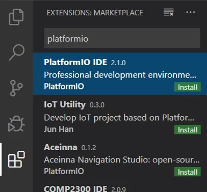 PlatformIO IDEinto the search window. - Install the PlatformIO IDE.