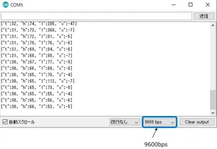 Section titled “Execution result”Open the serial monitor in the Arduino IDE and set the baud rate to 9600 bps to display the sensor data (temperature, humidity, illumination, and tilt).