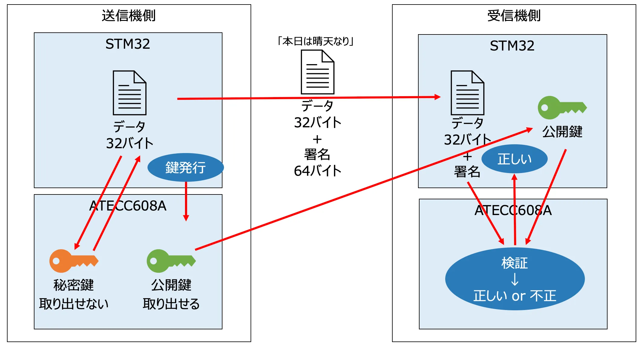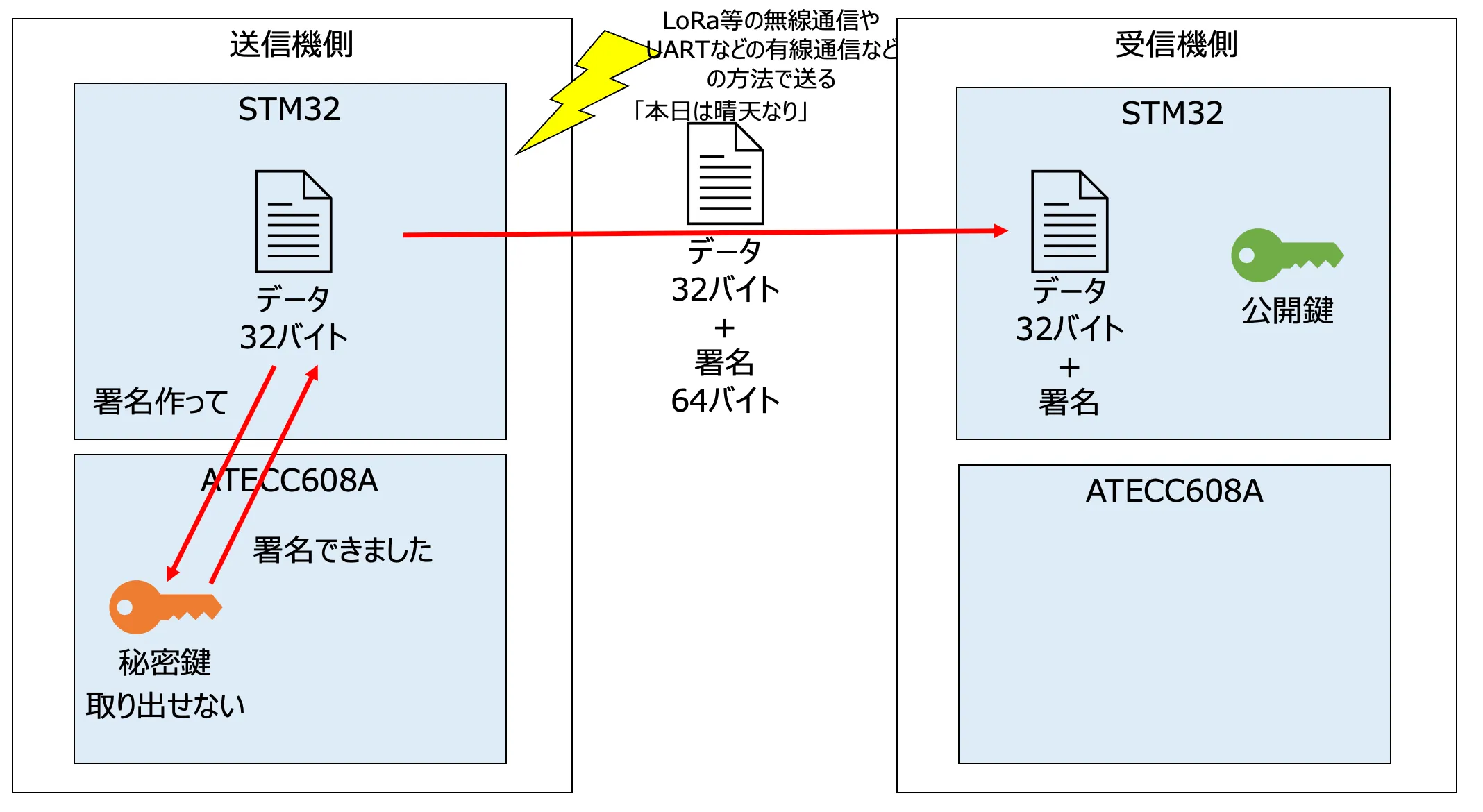 Section titled “ATECC608Aで署名付き通信を行う仕組み”送信機と受信機に搭載されているAC07 LoRa Maryリーフには、Microchip社の暗号化チップATECC608Aが搭載されています。 このチップは楕円曲線DSA署名方式(ECDSA)を使用した署名をハードウェアの演算回路を使用して発行することができます。 ATECC608Aを使用した署名の発行と、データ通信の流れを図に表したものを下記に示します。 この図をもとに署名付き通信の流れを解説します。