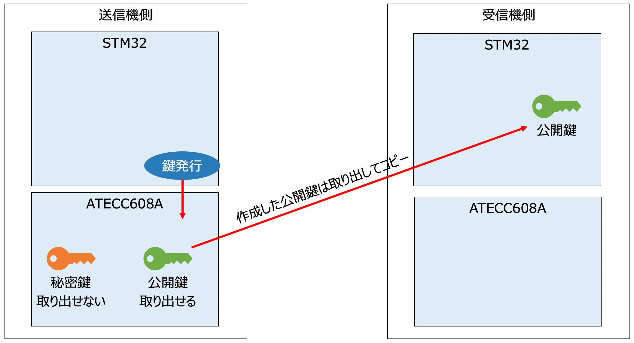 Section titled “1. キーペアを発行する”まず初めに、署名の発行を行うためにATECC608Aの初期化をする必要があります。 この初期化手順では、署名を行うためのキーペアをATECC608Aに発行してもらいます。 STM32リーフからI2CでATECC608Aにキーペア発行命令を送り、公開鍵と秘密鍵のキーペアを作成します。この時、公開鍵はI2C経由でSTM32リーフに伝えられ読み出すことができますが、秘密鍵はATECC608A内部のメモリーにのみ保存され、STM32側は読み出すことができない仕組みとなっています。