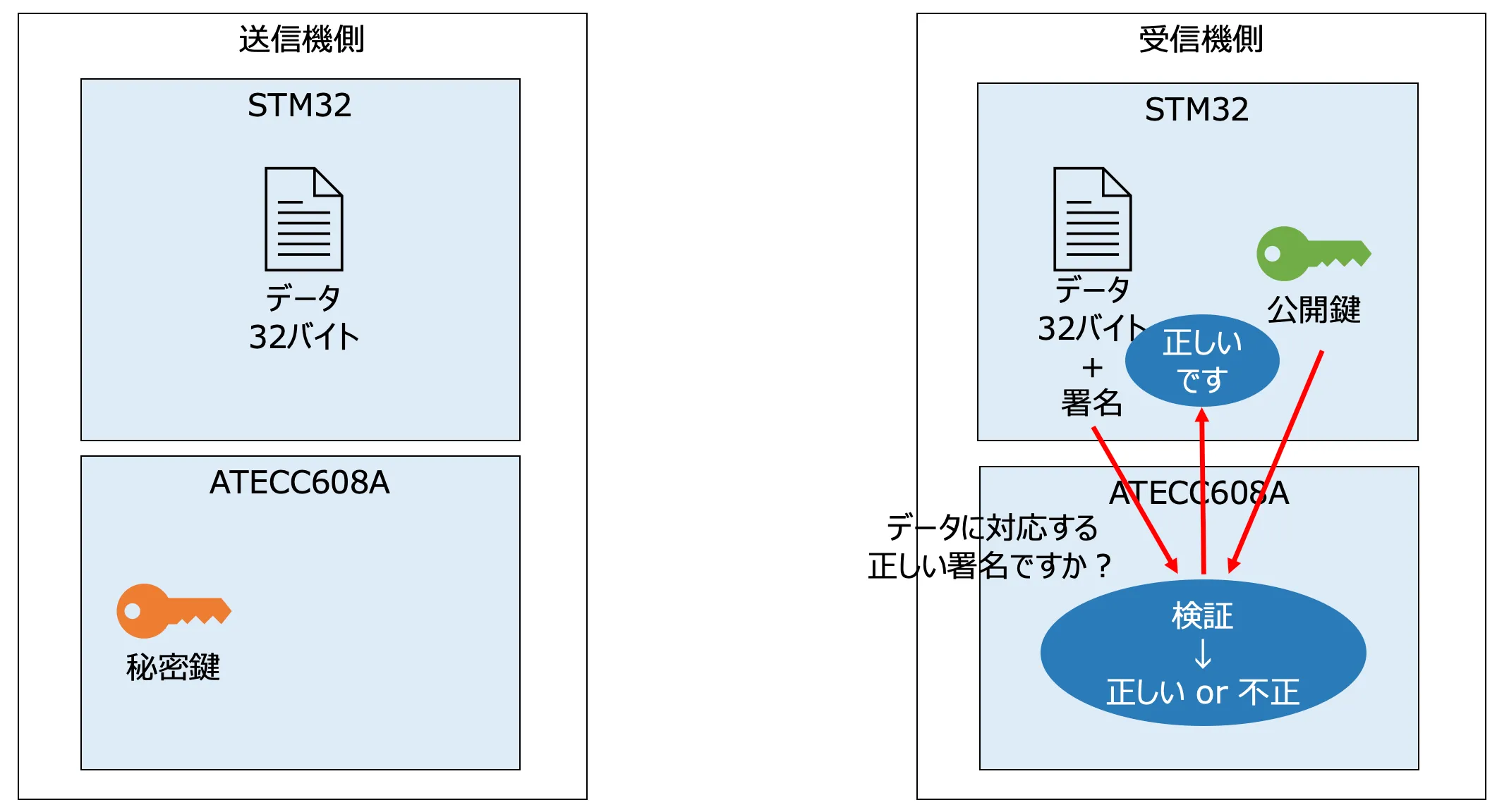Section titled “3. 受信機で署名を検証する”署名付きメッセージを受信した受信機は、あらかじめ持っていた送信機の公開鍵と、受信したメッセージ、署名データをATECC608Aに渡します。ATECC608Aはこれらのデータから署名がこの公開鍵に対応する秘密鍵によって発行されたものかを検証します。