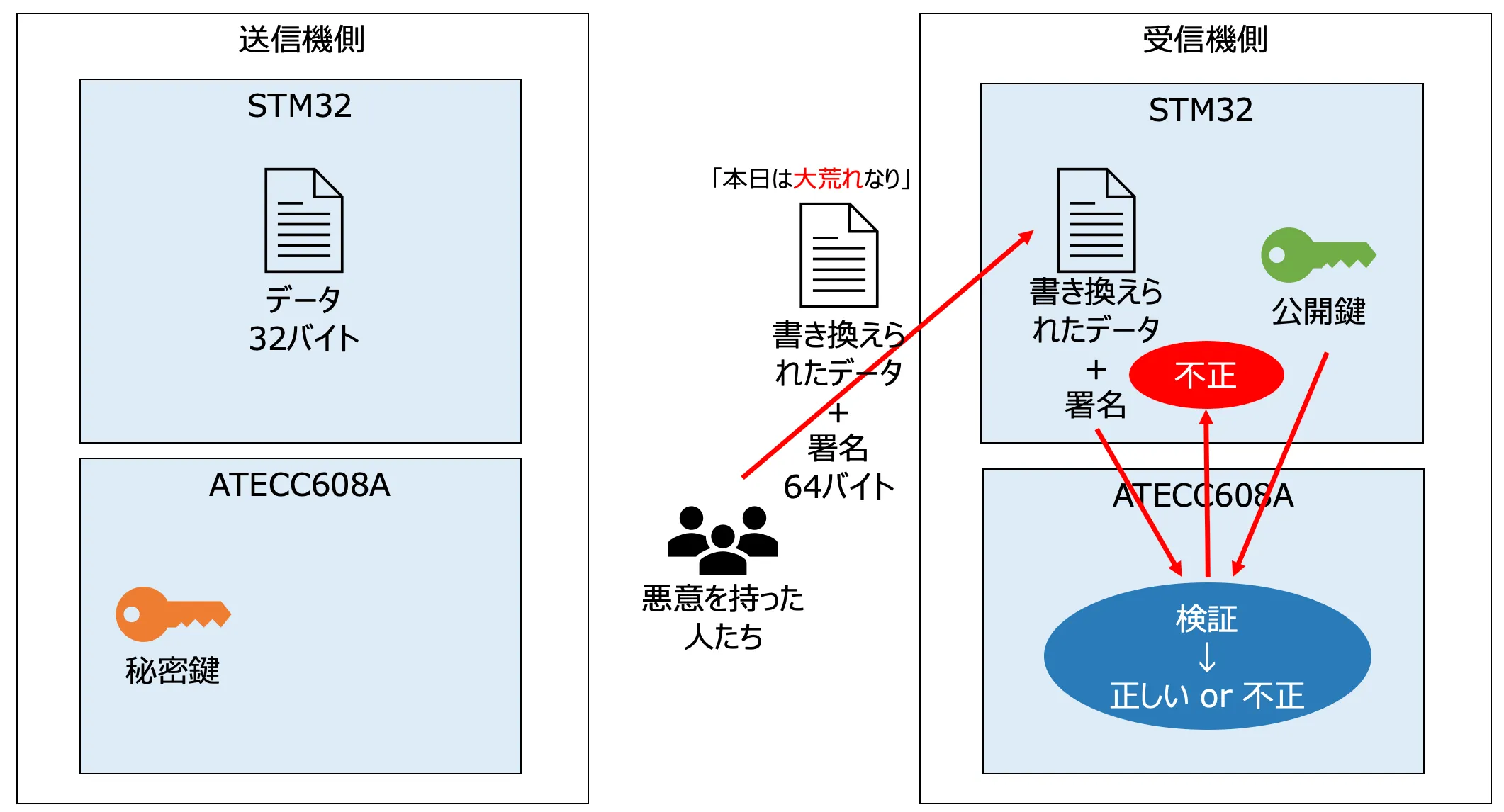 Section titled “4. 不正なデータが送られてきた”ここで、悪意を持った人が「本日は大荒れなり」というデータを送ってきたとします。これにはなんらかの署名がつけられていたとします。この不正なデータについた署名は、本来想定している送信機の秘密鍵を用いて作られた署名ではないため、受信機は公開鍵をもとに検証を行うと、キーペアの不一致によって検証結果は不正となります。