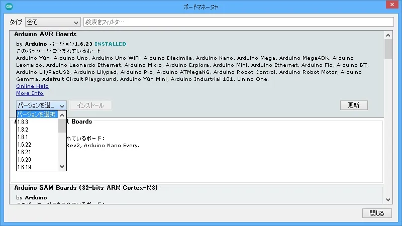 Arduino AVR Boardsは、IDEと一緒にインストールされます。Arduino AVR Boardsのバージョンは、ツール→ボード→ボードマネージャで確認をすることが出来ます。バージョンを選択をすれば、以前のものをインストールすることが出来ます。