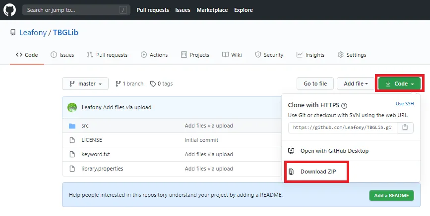 Section titled “2. ライブラリをダウンロード”上記表のリンクをクリックすると、ライブラリのGitHubリポジトリにアクセスします。Code → Download ZIPをクリックし、ライブラリをダウンロードします。