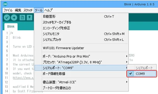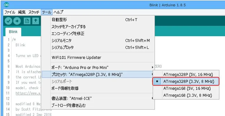 ツール → ボードから、Arduino Pro or Pro Miniを選択、プロセッサでATmega328P (3.3V,8MHz)を選択します。