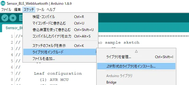 Section titled “3. ライブラリをインクルード”Arduinoを立ち上げ、スケッチ → ライブラリをインクルード → ZIP形式のライブラリをインストールの順に選択して、先程ダウンロードしたZIPファイルを読み込みます。