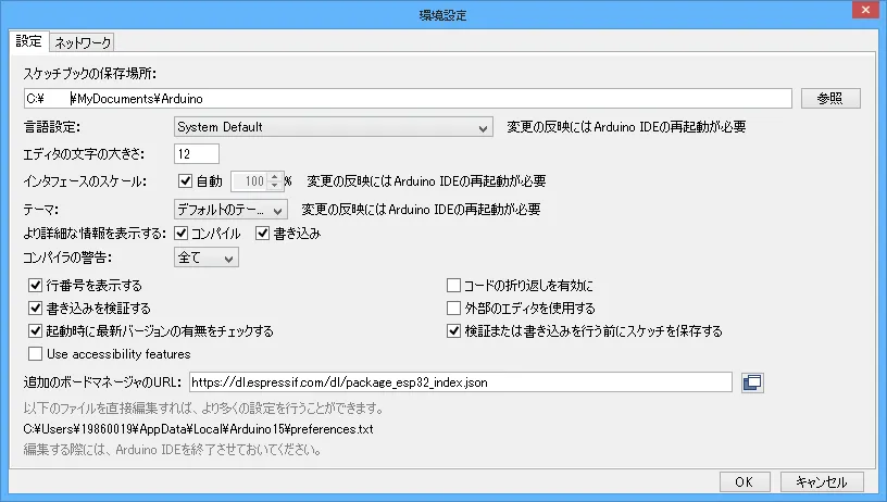 Section titled “マイコンボードの設定”esp32のボードは、webサイトからインストールします。ファイル → 環境設定を開き、追加のボードマネージャのURL:に、下記URLを入力してください。