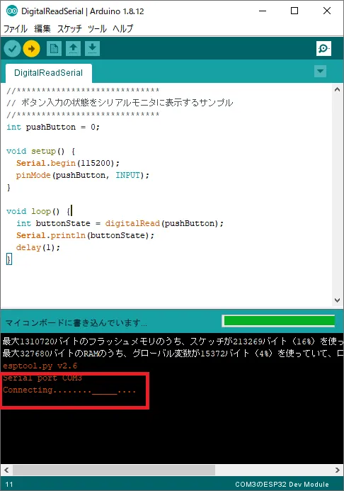 115200bpsにします。 Bootモードスイッチ(IO0)を押してスイッチの入力状態が変わるのを確認します。