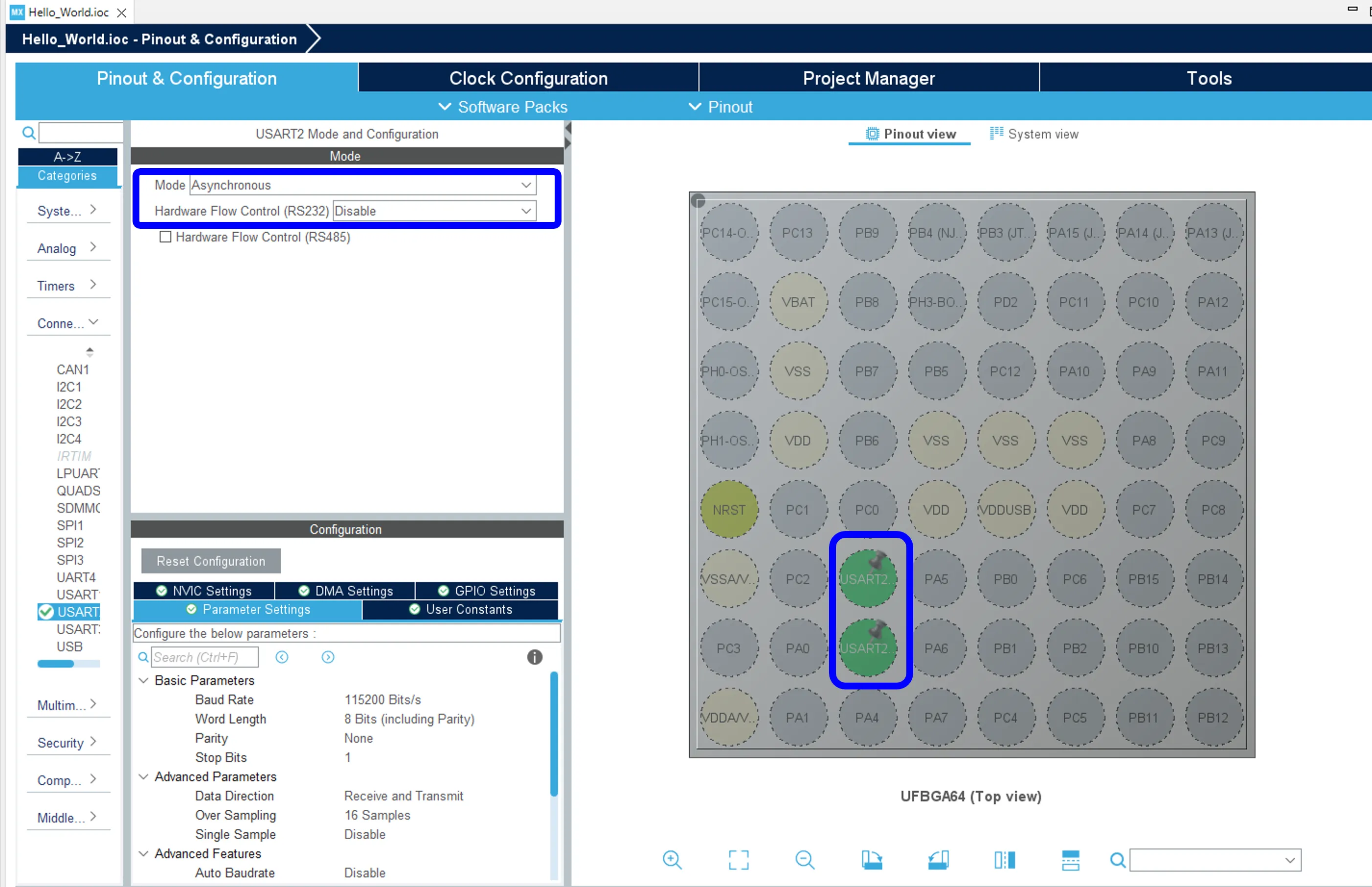 Hello_World.iocで、UARTの設定をします。