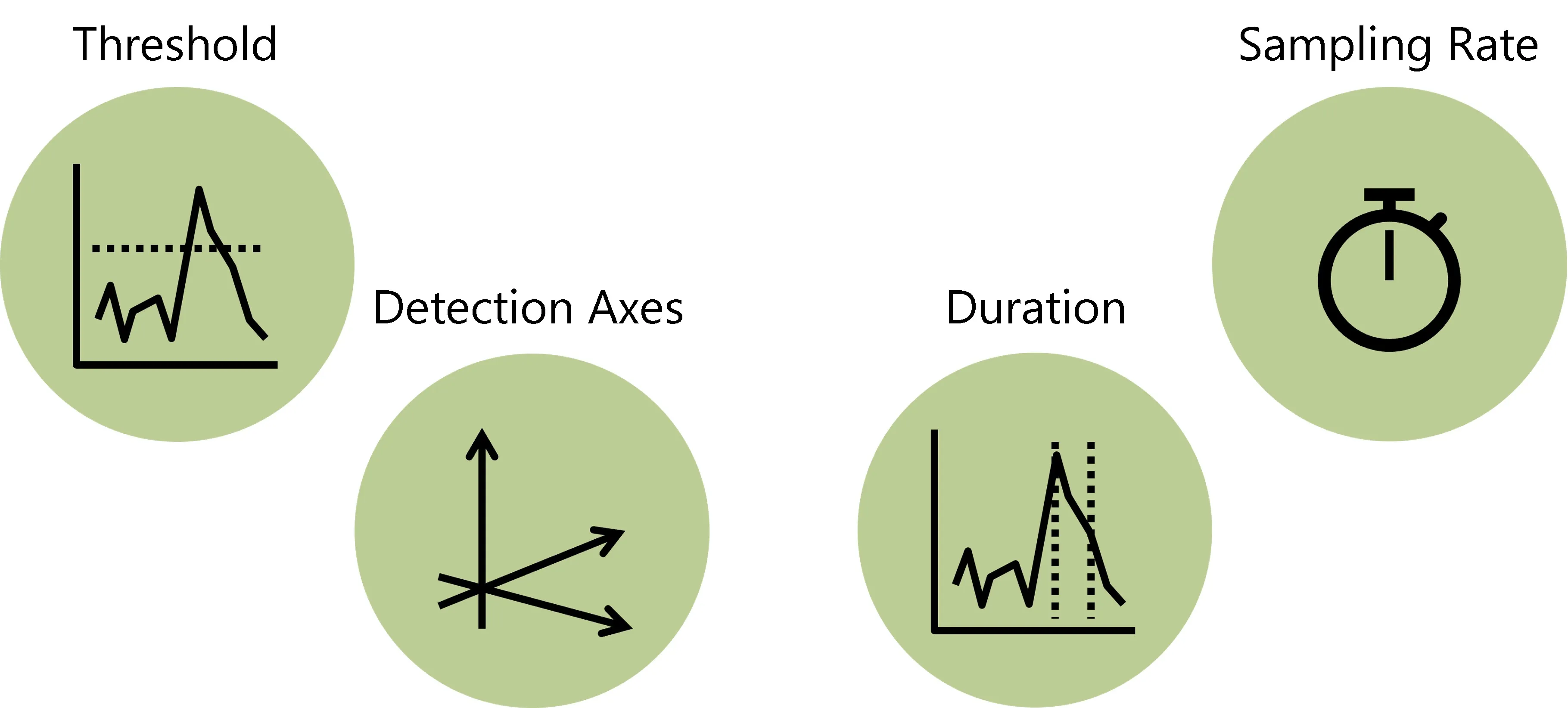 - サンプリング周波数:センサが加速度を取得する時間間隔を設定できます。周波数が上がるほど,時間分解能は上がりますが,その分センサの消費電力も増加してしまいます。