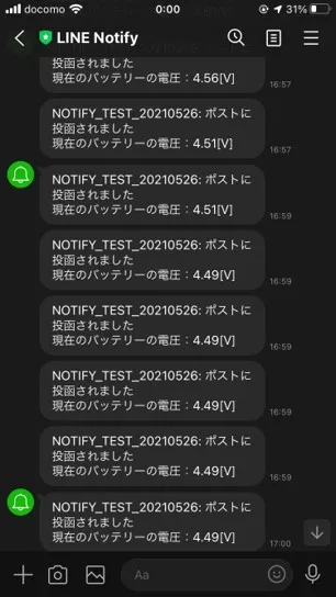 // LINEへの送信処理function sendToLine(text){var token = "line_notify_token";var options ={"method" : "post","payload" : "message=" + text,"headers" : {"Authorization" : "Bearer "+ token}};UrlFetchApp.fetch("https://notify-api.line.me/api/notify", options);}function doGet(e) {let id = 'google_sheets_id';let sheetName = 'sheet_name';var result;// e.parameter has received GET parameters, i.e. temperature, humidity, illuminationif (e.parameter == undefined) {result = 'Parameter undefined';} else {var sheet = SpreadsheetApp.openById(id).getSheetByName(sheetName);var newRow = sheet.getLastRow() + 1; // get row number to be insertedvar rowData = [];// get current timerowData[0] = new Date();rowData[1] = e.parameter.UniqueID;rowData[2] = e.parameter.temperature;rowData[3] = e.parameter.humidity;rowData[4] = e.parameter.illumination;rowData[5] = e.parameter.battery;// 1 x rowData.length cells from (newRow, 1) cell are specifiedvar newRange = sheet.getRange(newRow, 1, 1, rowData.length);// insert data to the target cellsnewRange.setValues([rowData]);result = 'Ok';}var lineMessage = "ポストに投函されました\n現在のバッテリーの電圧:" + e.parameter.battery + "[V]";sendToLine(lineMessage);return ContentService.createTextOutput(result);} - 3行目: LINE通知サービスの設定の6の画面で発行されたトークンの記号列に置き換える