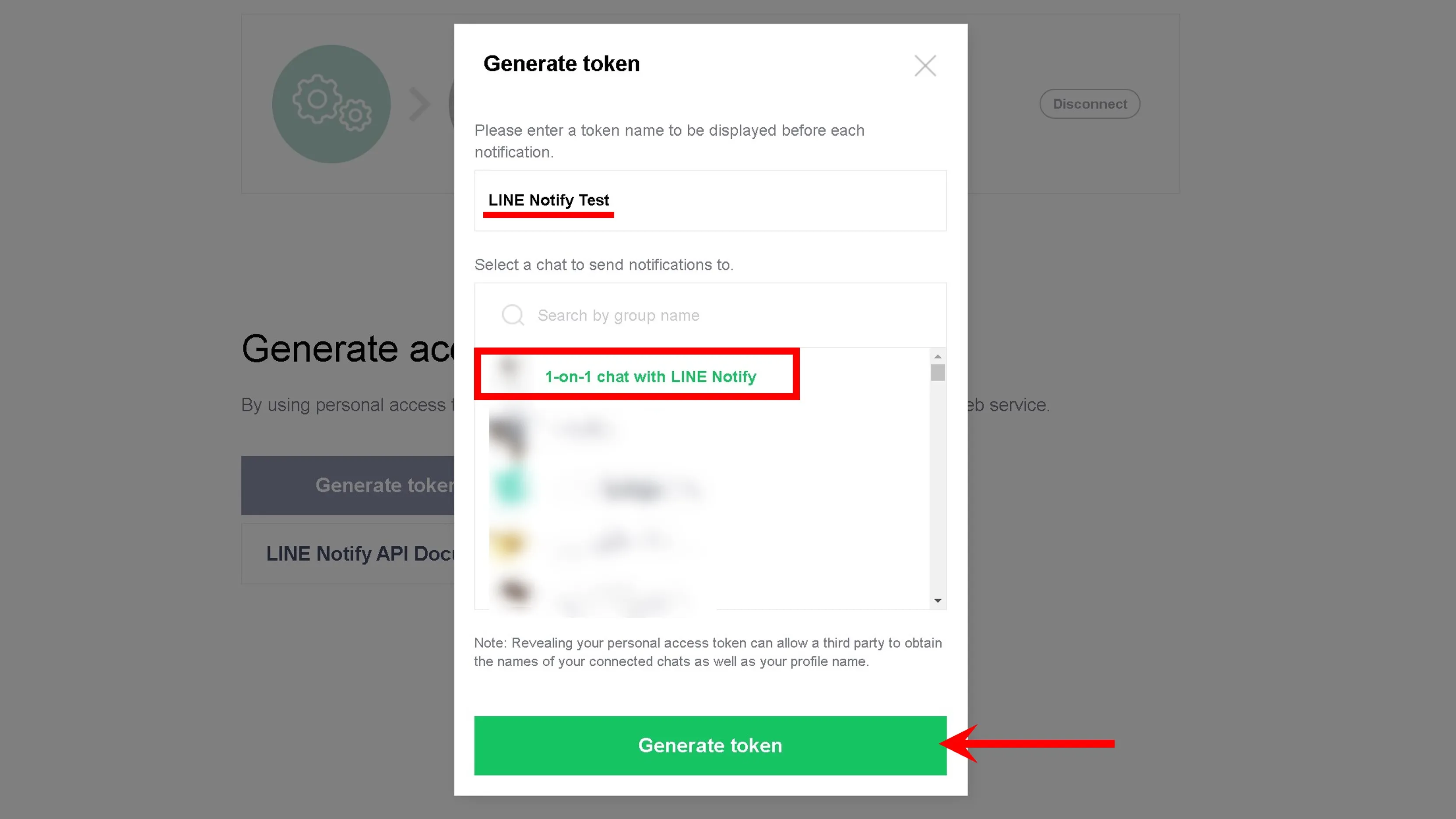 トークンの名前を入力し、通知を送信するグループを選択する。