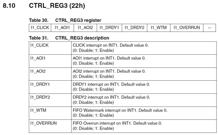 データシートによると割り込み信号の指定にはCTRL_REG3というレジスタに書き込みます。