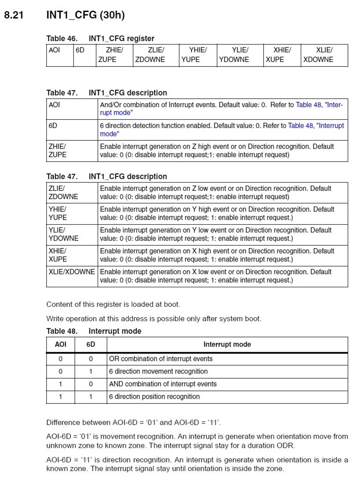 writeRegister8(LIS3DH_REG_CTRL1, 0x2C);INT1_CFGに関して、上のデータシートに、AOIと6Dというよく分からない項目があります。
