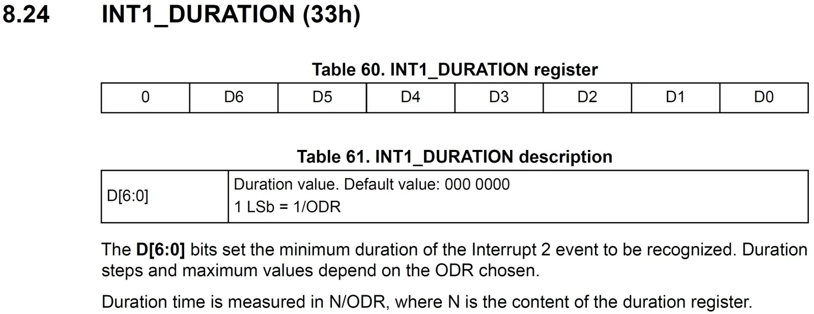 時間幅の設定レジスタはINT1_DURATIONです。実際にセンサは連続時間を測っているわけではなく、サンプリング回数で時間間隔を計算しています。
