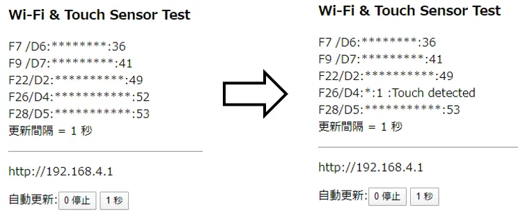 工場出荷時に、ESP32 MCUリーフにArduinoのスケッチが書き込まれているので、スマートフォンやパソコンのWi-Fiを使ってタッチセンサの値を送信して、表示がされます。