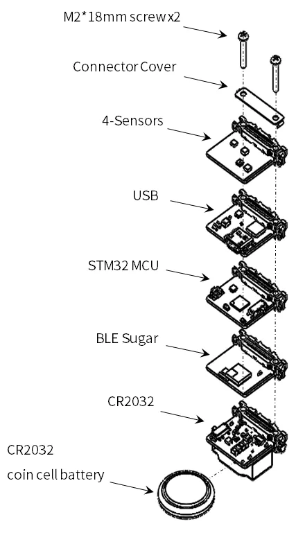 Section titled “用意するもの”- STM32 MCU、BLE Sugar、4-Sensors、CR2032、USB