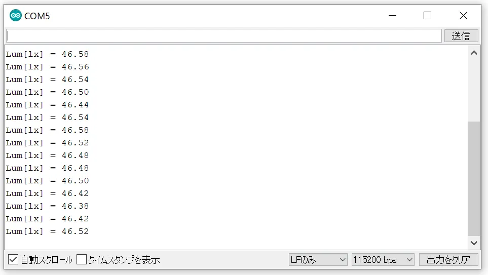 }Arduino IDEのシリアルモニタを開き、ボーレートを115200bpsとすると、照度が表示されます。