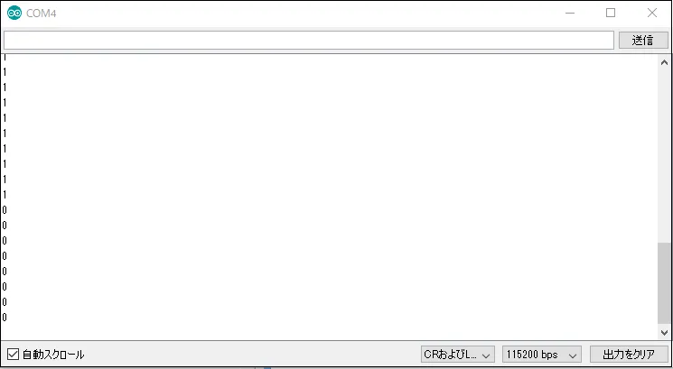void loop() { int buttonState = digitalRead(pushButton); Serial.println(buttonState); delay(1000);}Boot mode スイッチを押すと、シリアルモニタの表示が、1から0に変わります。