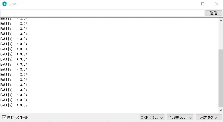 Serial.println("Batt[V] = " + String(dataBatt)); delay(1000);}Arduino IDEのシリアルモニタを開き、ボーレートを115200bpsとすると、電池の電圧が表示されます。