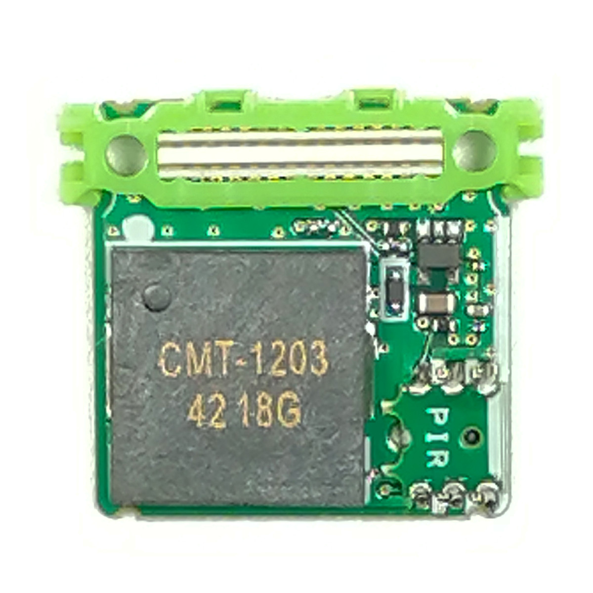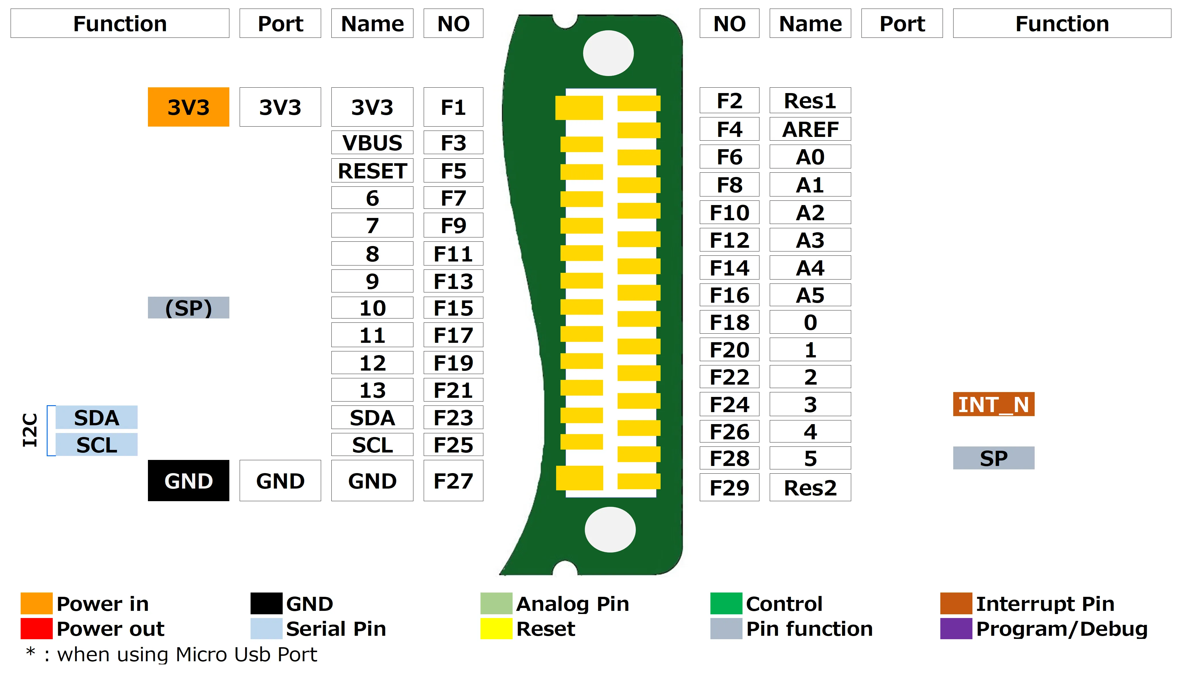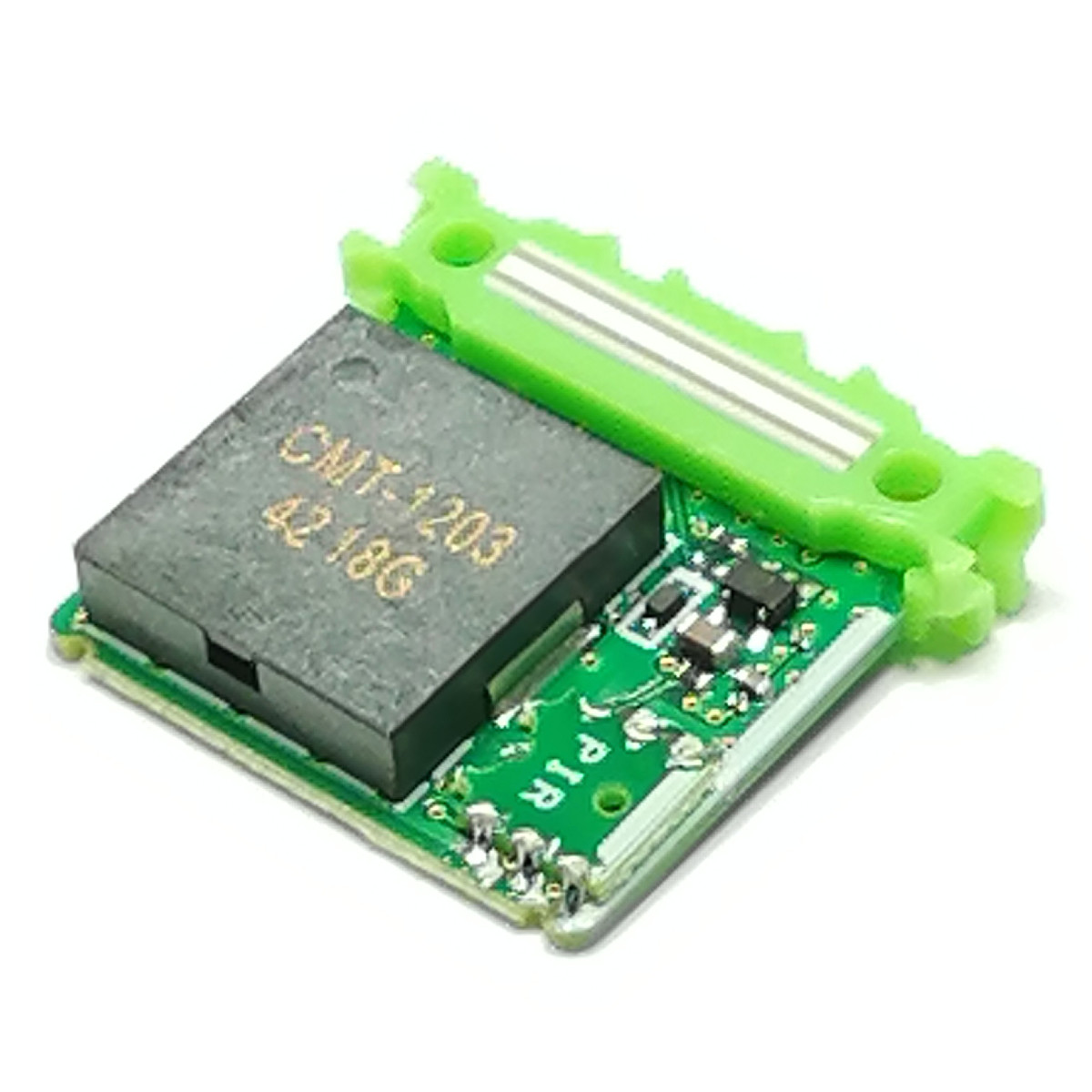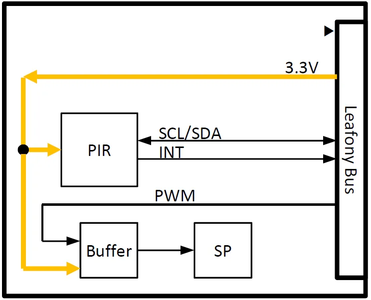 圧電スピーカと人感センサを搭載したリーフです。圧電スピーカはPWM、人感センサはI2CでMCUリーフと接続されます。人感センサは接近検知アルゴリズムを内蔵しており、簡単な設定で接近を検知することが出来、接近検知時に割り込み信号を出力することが可能です。
