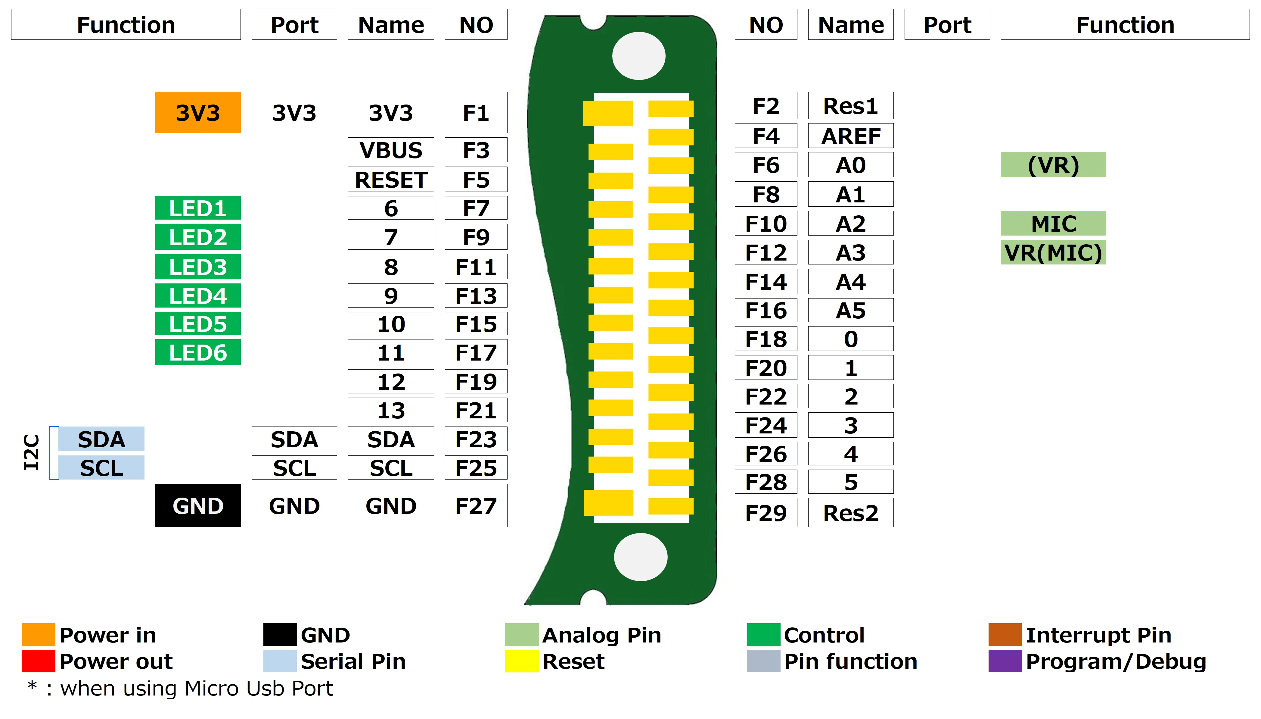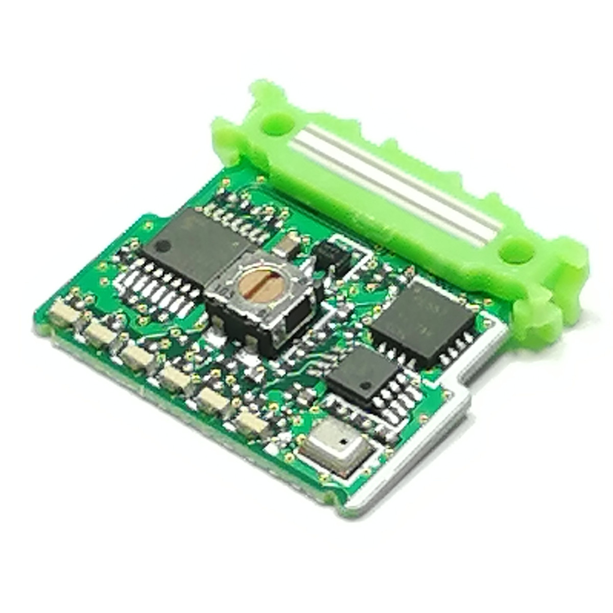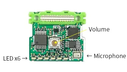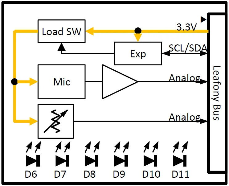 MEMSマイク、ボリューム、LEDを搭載したリーフです。MEMSマイクとボリュームはアナログ入力ピン、LEDはデジタル出力ピンでMCUリーフと接続されます。低消費電力を実現するのためI2C Expander を制御することにより電源をロードスイッチによりオフすることが可能です。