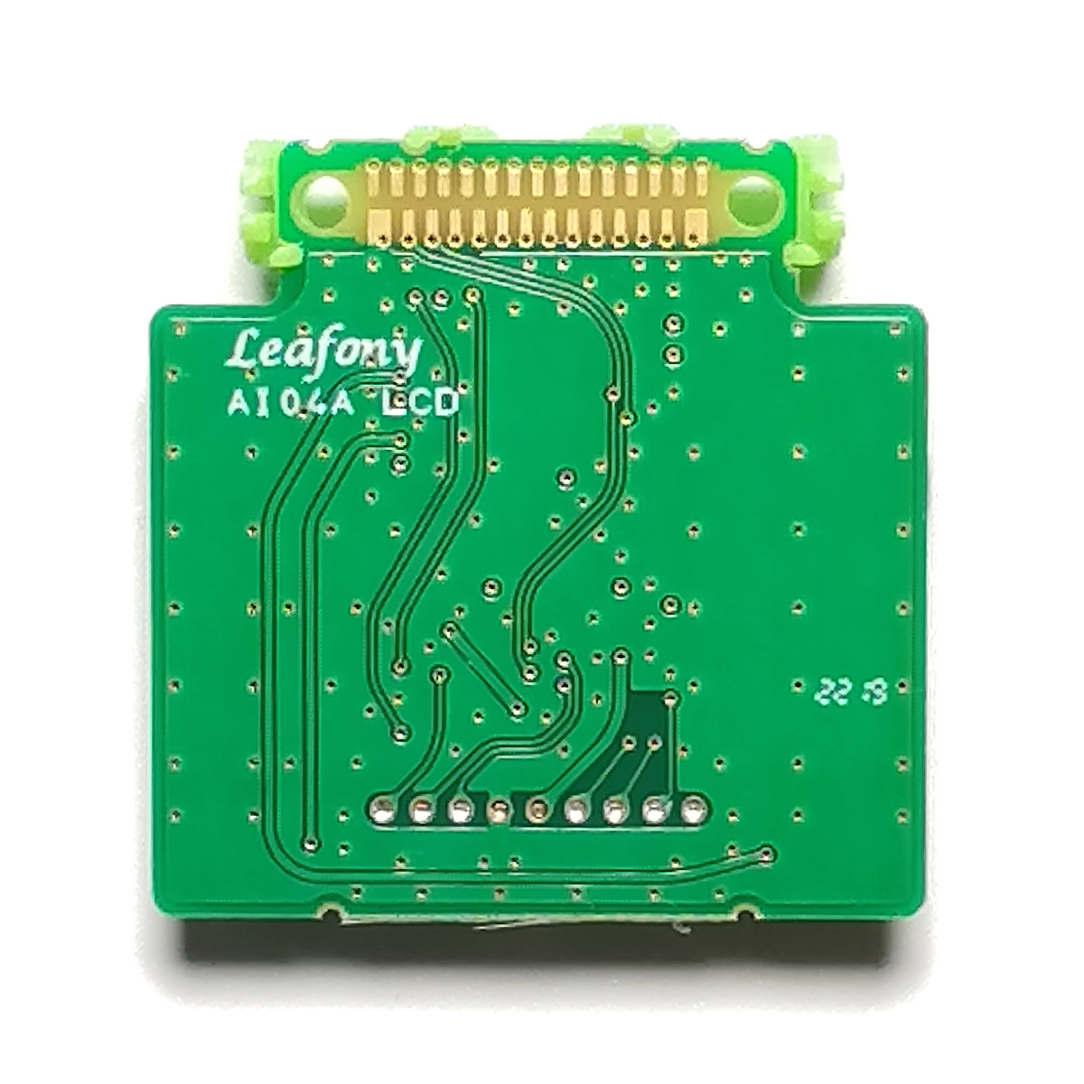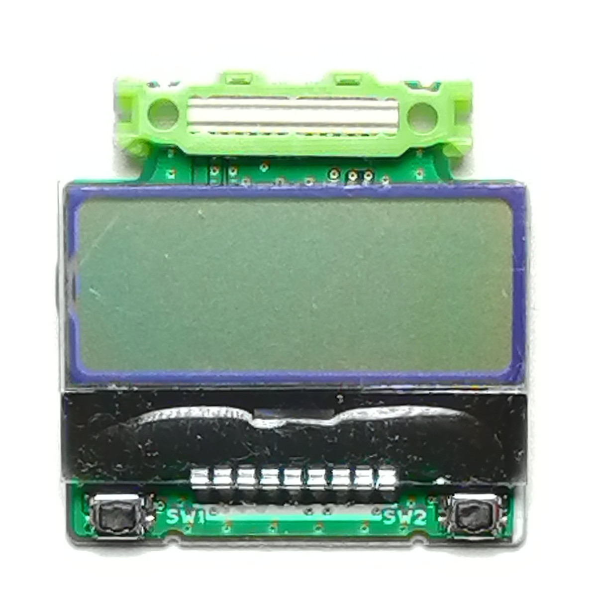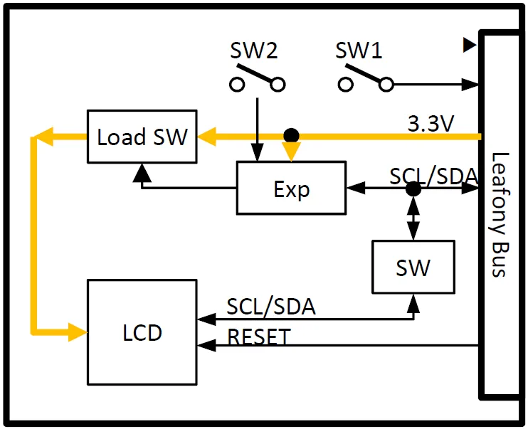 キャラクタLCDユニットとスイッチ2個を搭載したリーフです。LCDユニットはI2CでMCUリーフと接続されます。スイッチはMCUのデジタル入力ピンとI2C ExpanderのP1ピンに接続されています。 低消費電力化を実現するためI2C Expander を制御することにより電源をロードスイッチによりオフすることが可能です。