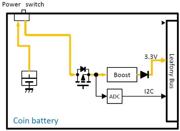 CR2450コイン電池ホルダを実装し、3Vの電池電圧を昇圧電源回路により3.3Vに変換し、3.3Vを各リーフに供給するリーフです。3.3Vをオン/オフするためのスイッチを実装しています。また、電池電圧をモニタするためのADコンバータを実装しています。