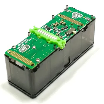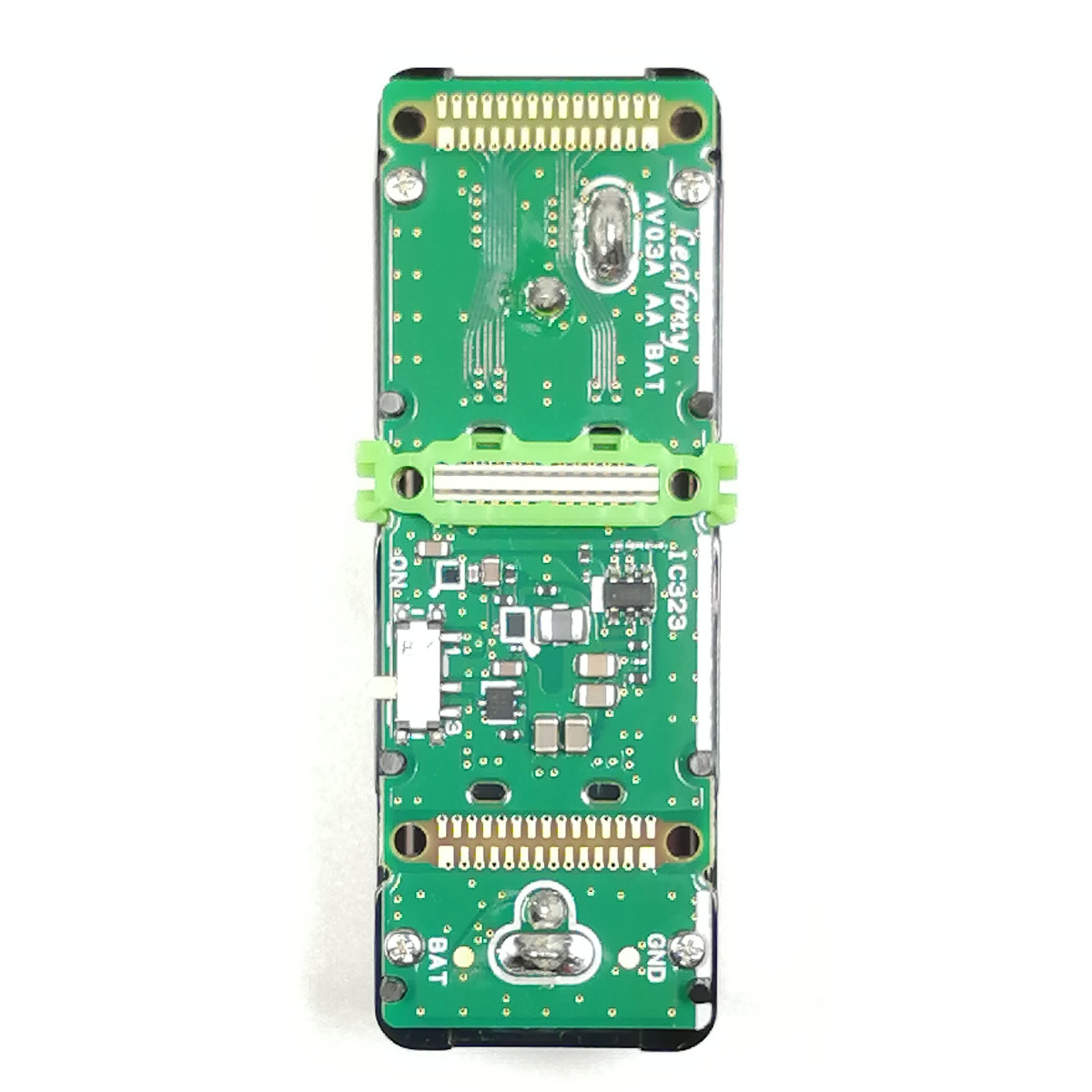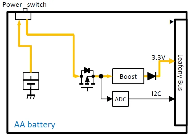 単3電池ホルダを実装し、1.5Vの電池電圧を昇圧電源回路により3.3Vに変換し、3.3Vを各リーフに供給するリーフです。3.3Vをオン/オフするためのスイッチを実装しています。また、電池電圧をモニタするためのADコンバータを実装しています。